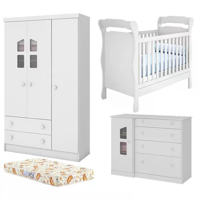 Jogo de quarto infantil, com um design lindo e sofisticado, deixando o ambiente ainda mais moderno e aconchegante. Estrutura em MDP de 15mm e MDF de 12mm, 15mm, e 25mm, feito com material ecológicamente correto, para melhor durabilidade e resistência à peça, pintura atóxica livre de materiais pesados, e excelente acabamento UV (). Composto por um berço infantil certificado pelo InMetro, contendo estrado em MDF de 6mm com altura regulável em três opções: 1ª: 37cm 2ª: 50cm e 3ª: 63 cm, travessas em MDF de 25mm, grades fixas, bordas arredondadas para maior segurança do bebê, acompanha suporte para mosquiteiro. Pode ser montado como berço ou como mini cama, após transformação em mini cama, acompanha duas laterais de proteção para noites mais seguras. Um colchão com espuma 100% poliuretano flexível, revestimento em tecido poliéster, com bordado contínuo, densidade D18, tem tratamento antialérgico, e uma face em plástico que protege a superfície contra a penetração de líquidos. Uma cômoda contendo 04 gavetas externas, 01 porta de bater, prateleiras com amplo espaço interno, e sistema anti-tombamento para evitar riscos de acidentes. Um guarda roupa contendo 03 portas de bater, cabideiro oblongo metálico, pés com regulagem inclusos na embalagem, permitindo que o móvel seja perfeitamente nivelado e evitando o contato dele com o chão, ótima divisão interna para roupas, 02 gavetas externas, e prateleiras internas para melhor organização. Ambos os produtos possuem corrediças metálicas, dobradiças metálicas, detalhe usinado em acrílico incolor, e puxadores em plástico com um ótimo design e padrão de acabamento. Mais produtos da linha infantil Amore, você encontra em nosso site, podendo fazer a composição completa para o quarto do seu (sua) filho (a). Este móvel chegará em sua casa separado em 06 volumes.