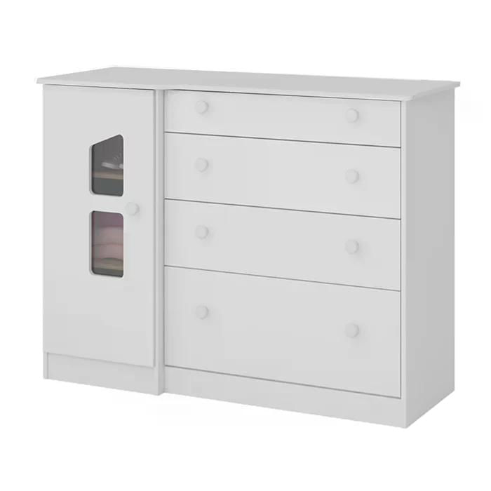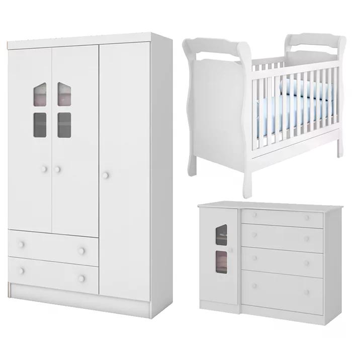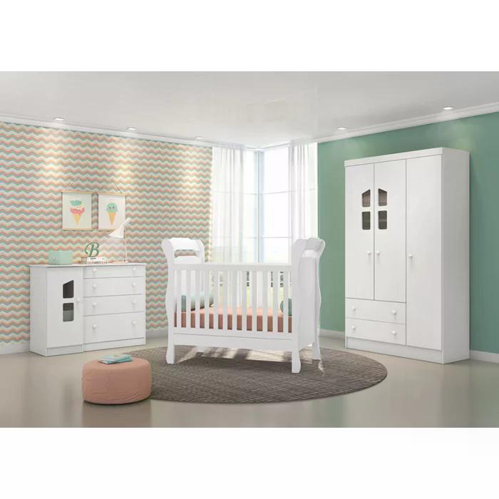 Jogo de quarto infantil, com um design lindo e sofisticado, deixando o ambiente ainda mais moderno e aconchegante. Estrutura em MDP de 15mm e MDF de 12mm, 15mm, e 25mm, feito com material ecológicamente correto, para melhor durabilidade e resistência à peça, pintura atóxica livre de materiais pesados, e excelente acabamento UV (). Composto por um berço infantil certificado pelo InMetro, contendo estrado em MDF de 6mm com altura regulável em três opções: 1ª: 37cm 2ª: 50cm e 3ª: 63 cm, travessas em MDF de 25mm, grades fixas, bordas arredondadas para maior segurança do bebê, acompanha suporte para mosquiteiro. Pode ser montado como berço ou como mini cama, após transformação em mini cama, acompanha duas laterais de proteção para noites mais seguras. O colchão indicado é de 130x70 (Padrão Americano). Uma cômoda contendo 04 gavetas externas, 01 porta de bater, prateleiras com amplo espaço interno, e sistema anti-tombamento para evitar riscos de acidentes. Um guarda roupa contendo 03 portas de bater, cabideiro oblongo metálico, pés com regulagem inclusos na embalagem, permitindo que o móvel seja perfeitamente nivelado e evitando o contato dele com o chão, ótima divisão interna para roupas, 02 gavetas externas, e prateleiras internas para melhor organização. Ambos os produtos possuem corrediças metálicas, dobradiças metálicas, detalhe usinado em acrílico incolor, e puxadores em plástico com um ótimo design e padrão de acabamento. Mais produtos da linha infantil Amore, você encontra em nosso site, podendo fazer a composição completa para o quarto do seu (sua) filho (a). Este móvel chegará em sua casa separado em 05 volumes.