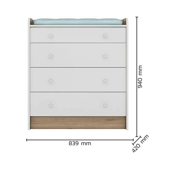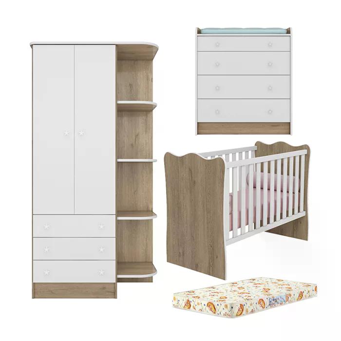 Jogo de quarto infantil, com um design lindo e sofisticado, deixando o ambiente ainda mais moderno e aconchegante. Estrutura em MDP de 15mm e 12mm, feito com material ecológicamente correto, para melhor durabilidade e resistência às peças, pintura atóxica livre de materiais pesados, e excelente acabamento UV (Brilho). Composto por portas de bater com dobradiças metálicas, cabideiro oblongo metálico, ótima divisão interna para roupas, gavetas externas com corrediças metálicas, puxadores em plástico com formato de estrela, bordas arredondadas em perfil PVC, cantoneira, prateleiras para melhor organização, trocador embutido que garante mais praticidade no dia-dia, estrado do berço em MDF de 6mm com altura regulável em três opções: 1ª: 35cm 2ª: 48cm e 3ª: 61cm, travessas em MDF de 25mm, suporte para mosquiteiro, sistema anti-tombamento para evitar riscos de acidentes, colchão com espuma 100% poliuretano flexível, revestido em tecido poliéster com bordado contínuo, densidade D18, e tratamento antialérgico com face em plástico que protege a superfície contra a penetração de líquidos. O berço é certificado pelo InMetro. Mais produtos da linha infantil Doce Sonho, você encontra em nosso site, podendo fazer a composição completa para o quarto do seu (sua) filho (a). Estes móveis chegarão em sua casa separados em 06 volumes.