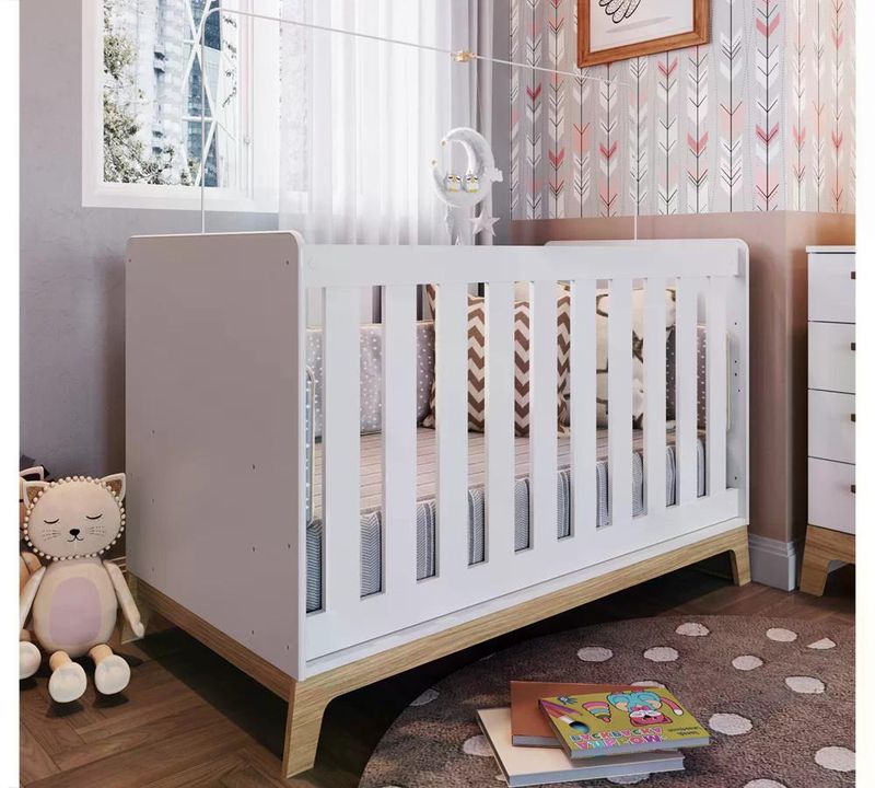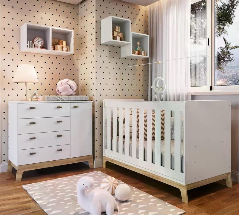 Quarto Infantil Berço, Cômoda e Nichos de Parede. Estrutura em MDP de 15mm, com acabamento em pintura BP (Fosco). Berço Multifuncional 3 Em 1, transforma-se em mini cama, facilitando e tornando prático para a mamãe e o papai no decorrer dos meses, suporte do estrado em madeira e os lastros do estrado são em MDF, possui três opções para regulagem de altura do colchão (colchão não incluso), possui grades fixas de talas largas em MDF proporcionando maior segurança e tranquilidade aos pais, é indicado para colchão medindo 130x60 cm, conta com suporte para mosquiteiro. Cômoda composta por 01 porta com dobradiças metálicas, 01 prateleira interna, 04 gavetas com corrediças metálicas livres de enrosco e com deslize fácil, puxadores modernos e requintados, acompanha 02 Nichos Cubos e 01 Nicho Livreiro vai garantir a organização e decoração do ambiente. Mais produtos da Linha Favo de Mel, você encontra em nosso site, podendo fazer a composição completa para o quartinho do bebê. Estes móveis chegarão em sua casa separados em 06 volumes.