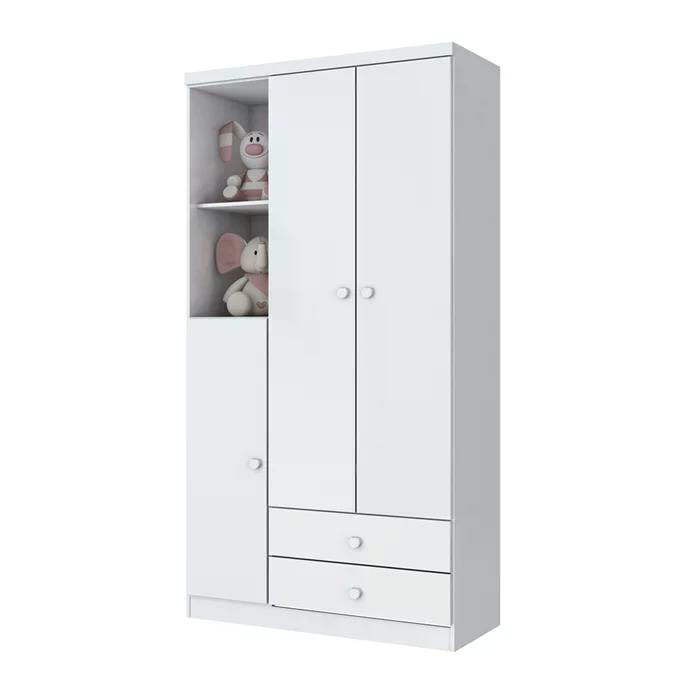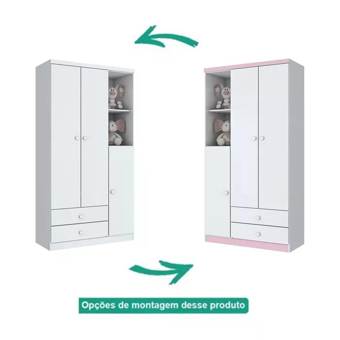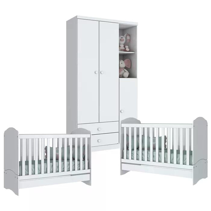 Quarto Infantil Para Gêmeos, Linha Bala de Menta da Henn, estrutura resistente em MDP e MDF, acabamento em pintura UV/PU (Brilho). 01 Roupeiro com portas com dobradiças metálicas e gavetas com corrediças metálicas, puxadores em ABS arredondados, prateleiras internas, nichos, cabideiro em alumínio, 02 Berços Mini Cama, Certificados pelo Inmetro, possibilita 03 formas de uso para acompanhar o crescimento da criança, ideal para colchão de 130 x 60 cm (Colchão Não Incluso), estrado resistente em madeira com regulagem de altura sendo a Regulagem Alta 56,4 cm do chão e a Regulagem Baixa 29 cm do chão, grades fixas, acompanha suporte para mosqueteiro. Estes móveis chegarão em sua casa separados em 3 volumes.