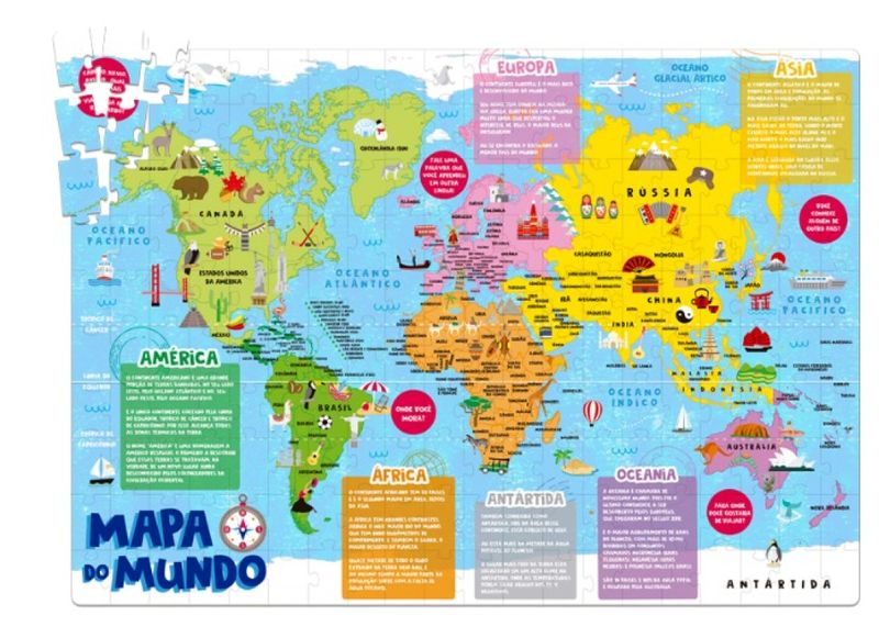 Brincando de montar este quebra-cabeça as crianças aprendem curiosidades sobre os continentes e seus países!