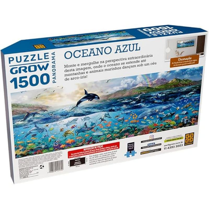 A Grow é pioneira e referência em quebra-cabeças no Brasil, desde 1977. Os melhores materiais são cuidadosamente selecionados sempre buscando qualidade para garantir um encaixe preciso e uma ótima experiência de montagem. Além de um excelente passatempo, de juntar a família e de melhorar a concentração, os Puzzles Grow se tornam lindos objetos de decoração. O Puzzle 1500 Peças Panorama Oceano Azul, traz um design único e exclusivo. Um quebra-cabeça encantador composto por 1500 peças, que formam uma linda imagem das profundezas oceânicas e sua rica vida marinha.