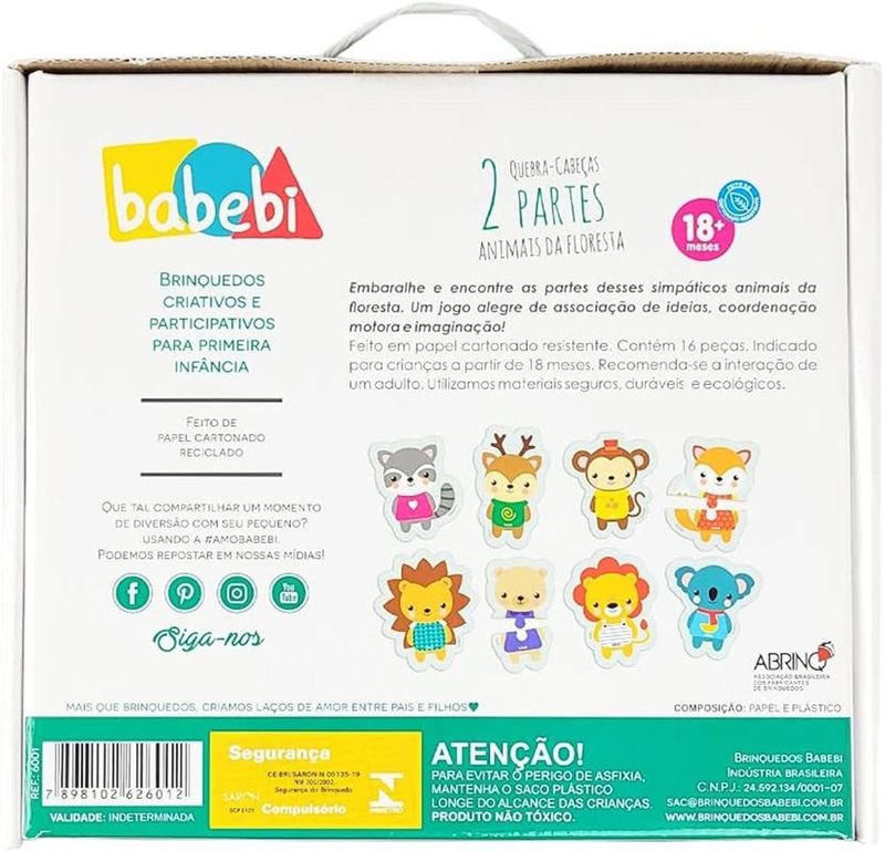 Quebra Cabeça 2 Partes Animais da Floresta - Babebi 6001 Embaralhe e encontre as partes desses simpáticos animais da floresta.