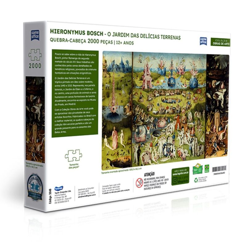 Descubra o desafio e a arte com o Quebra-Cabeça 2000 Peças O Jardim das Delícias Terrenas Toyster, inspirado na icônica obra de Hieronymus Bosch. Ideal para amantes de arte e quebra-cabeças avançados, este produto oferece uma experiência única que estimula a concentração e a criatividade. Com peças duráveis e encaixes precisos, é perfeito para montar momentos de lazer sozinho ou em família. Este quebra-cabeça não é apenas um passatempo, mas uma imersão na complexidade e nos detalhes do renascimento artístico. - 2000 peças para montagem detalhada e desafiadora - Imagem baseada na obra-prima “O Jardim das Delícias Terrenas” de Hieronymus Bosch - Estimula o raciocínio lógico e a paciência - Material resistente com encaixe perfeito para durabilidade - Indicado para maiores de 12 anos, ideal para colecionadores e entusiastas da arte Eleve seu hobby com um dos quebra-cabeças mais completos e sofisticados do mercado, reconhecido por sua riqueza visual e complexidade. Especificações: Código de Barras: 7896054030482 Restrição de Idade: Não recomendável para menores de 3 anos por conter peças pequenas que podem ser engolidas. Código do Fabricante: 3048 Aviso: As cores podem variar entre as imagens mostradas acima e o produto. Imagens meramente ilustrativas. Certificado: Certificado pelos Órgãos Autorizados - OCP´S (Organismos de Certificação de Produtos) Peso: 1,113 Kg Faixa Etária: 12+ Material: Papel, papel-cartão Dimensões (AxLxC): 40 x 10 x 28 cm Produto Certificado: 006878/2022 Itens Inclusos: 1 Quebra-cabeça Este produto é original? Sim, é um produto original da marca Toyster. Imagens meramente ilustrativas. As estampas e cores dos produtos podem variar de acordo com o lote disponível em estoque.