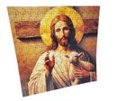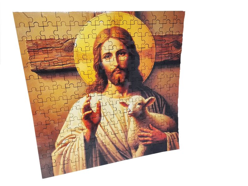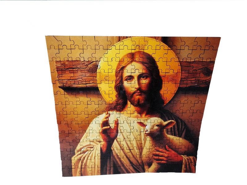 Esta obra de arte em forma de quebra-cabeça apresenta uma representação tocante do Bom Pastor, guiando e protegendo suas ovelhas com amor e compaixão.