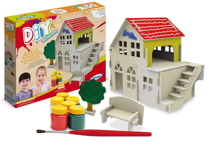 Depois de montada você pode personalizar ao colorir e decorar com tintas que acompanham o brinquedo, construindo sua própria casinha Faça Você Mesmo.