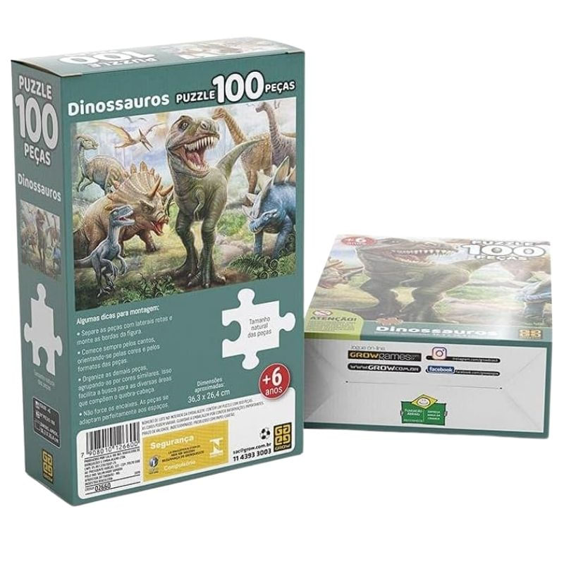 Quebra-cabeça infantil de 100 peças com uma vibrante ilustração de dinossauros. Ideal para crianças a partir de 6 anos, auxilia no desenvolvimento da coordenação motora fina, percepção visual, concentração e raciocínio lógico. Tamanho da Imagem :36,3 x 24,4 cm Características: - Conteúdo da Embalagem: 100 peças de quebra-cabeça- Marca: Grow- Modelo: 02660- Dimensões da Embalagem: 22,6cm, 14,5cm, 6cm- Código de Barras: 7908010126600- Certificação: INMETRO Recomendado para maiores de 6 anos. Importante: - Nossos produtos encontram-se em estoque- Todos os produtos são lacrados- Produtos acompanham nota-fiscal e garantia