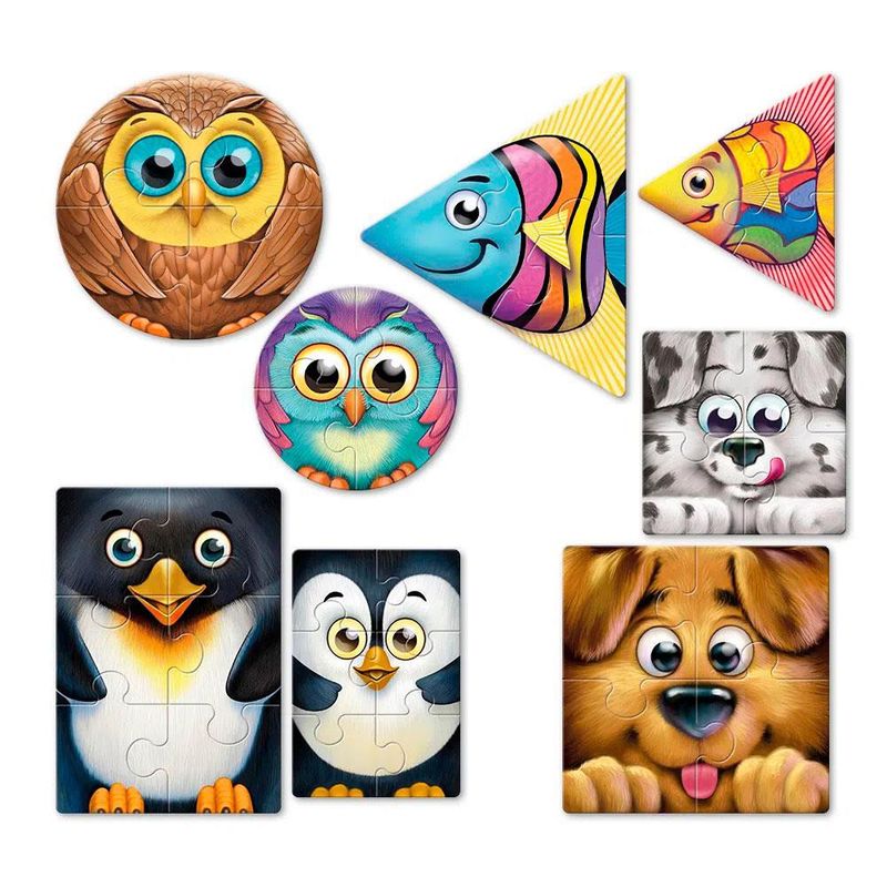 São 8 quebra-cabeças independentes, que representam as 4 formas básicas, em dois tamanhos. Cada forma é representada por uma dupla de animais, sendo um adulto e, o outro, filhote.