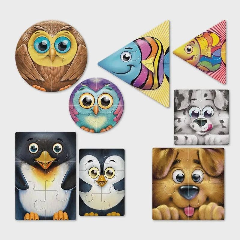 São 8 quebra-cabeças independentes, que representam as 4 formas básicas, em dois tamanhos. Cada forma é representada por uma dupla de animais, sendo um adulto e, o outro, filhote.