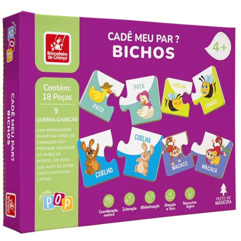 Quebra-Cabeca Madeira Cade Meu Par? Bichos 18Pcs