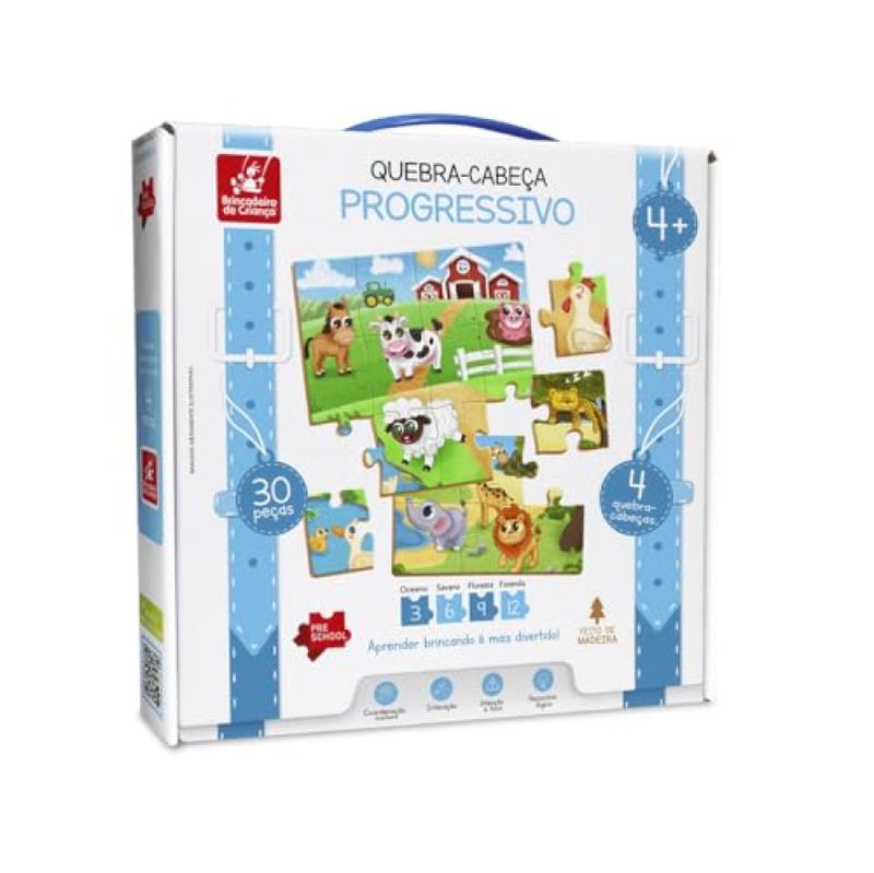 Material didatico para criancas em fase escolar. Sao 4 quebra-cabecas progressivos, ou seja, seguem uma sequencia: 3, 6, 9 e 12 pecas, e cada um apresenta animais em habitats diferentes. Sao 30 pecas em madeira, coloridas e divertidas que auxiliam em diversos aspectos no desenvolvimento da crianca, entre eles: Interacao, coordenacao motora, atencao e foco.