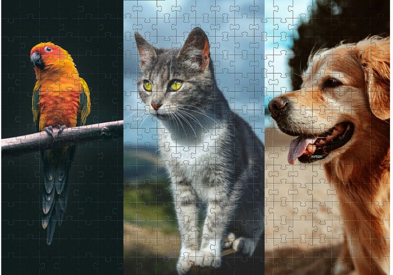 A cena retratada é encantadora: um cachorro, um gato e uma arara se olham, transmitindo uma sensação de harmonia entre diferentes espécies. As expressões dos animais e os detalhes coloridos da imagem criam uma atmosfera serena, capaz de prender a atenção e despertar o interesse do início ao fim. É o tipo de ilustração que convida a olhar com mais calma, valorizando cada parte da composição enquanto o quebra-cabeça vai sendo montado.