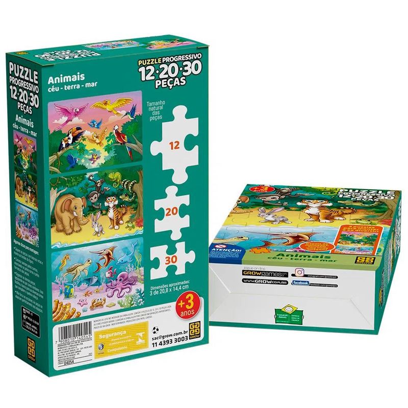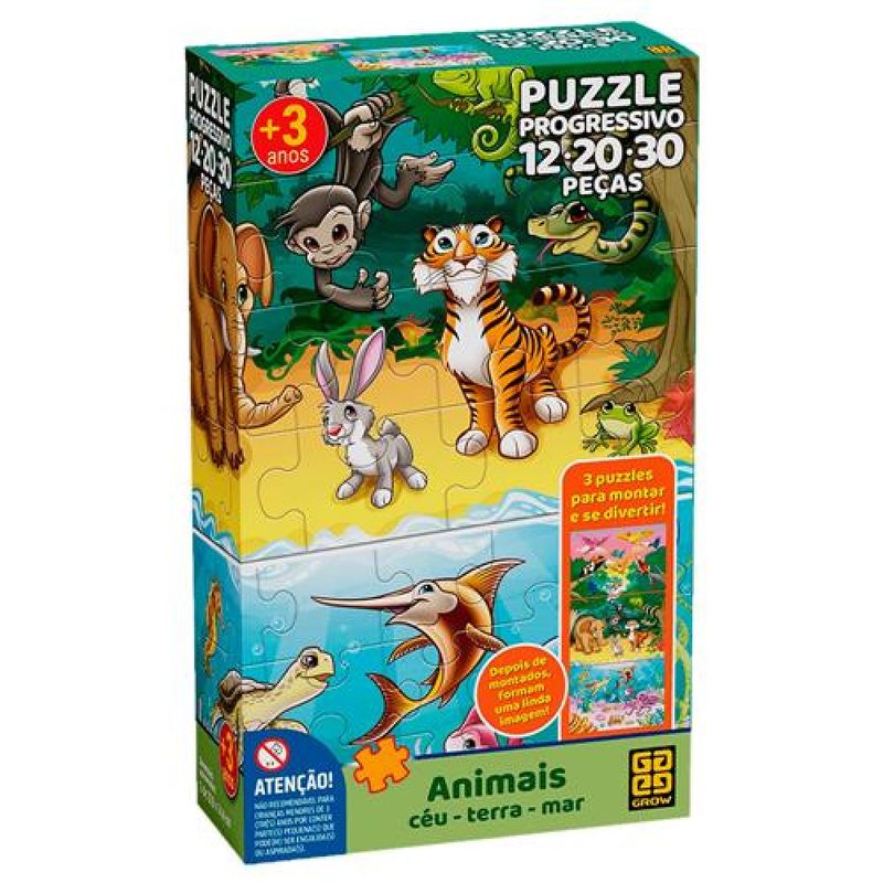 Com o Quebra-cabeça Progressivo Animais Céu, Terra e Mar 4054 Grow a criança monta as peças e se diverte com a carinha dos personagens. São 3 quebra-cabeças que contém simpáticas figuras de animais aquáticos, terrestres e aéreos. Ao final da montagem, os três puzzles se complementam, formando uma grande e linda imagem dos animais.