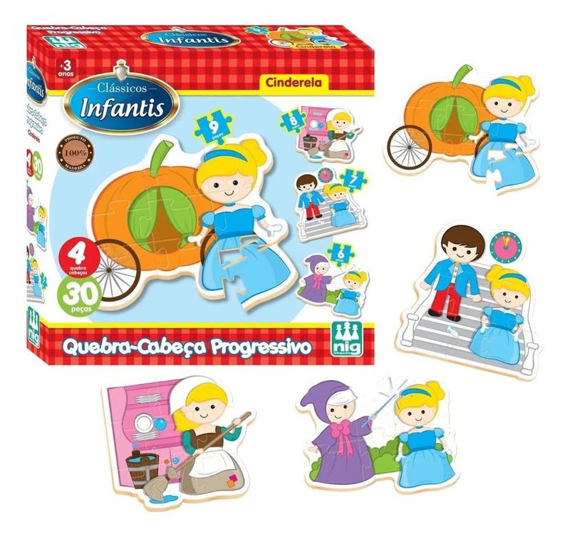 Aviso: Imagens meramente ilustrativas!!! Cinderela é o primeiro personagem da coleção de quebra-cabeças progressivos Clássicos Infantis da NIG. Contém 30 peças grandes em madeira, formando 04 ilustrações fofas. Indicado para crianças em fase pré-escolar, esse QC traz diferentes níveis de dificuldade, com 06, 07, 08 e 09 peças em madeira. Desenvolve a coordenação motora, a percepção visual e o raciocínio. Contém: 4 Quebra Cabeças Idade: 4+ anos Material: Madeira Reflorestada Marca: Nig Brinquedos