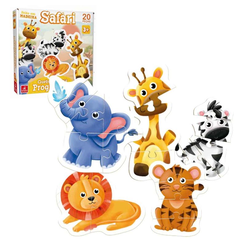 Os animais do Safari estão sempre prontos para novas aventuras! Com eles, a diversão não tem fim! Com esse incrível quebra cabeça a brincadeira vai ficando mais desafiadora. São 5 quebra cabeças, sendo 1 com 2 peças, 1 com 3 peças, 1 com 4 peças, 1 com 5 peças e 1 com 6 peças.