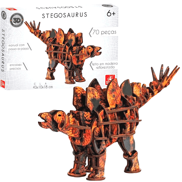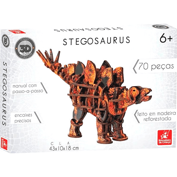Puzzle Stegosaurus Adventure 3D - Brincadeira de Criança Um super quebra-cabeça 3D para a garotada se divertir montando um Dinossauro Stegosaurus! Uma brincadeira divertida que estimula o raciocínio lógico, a percepção espacial e a coordenação motora! Confeccionado em madeira de reflorestamento, possui 51 peças e mede 43cm x 10cm x 18cm Indicado a partir de 6 anos.