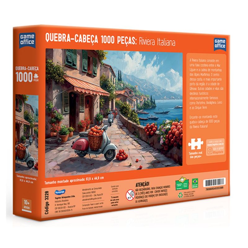 Explore a deslumbrante Riviera Italiana! Este quebra-cabeça captura a deslumbrante costa italiana em detalhes encantadores! Temos um padrão internacional de qualidade e encaixe suave que pode ser sentido em cada peça! Material: papel e papel cartão. Certificação Segurança: Selo Inmetro. Garantia do Fabricante: 03 meses contra defeitos de fabricação. Aviso: Imagens meramente ilustrativas. As cores podem variar entre as imagens mostradas acima e o produto.