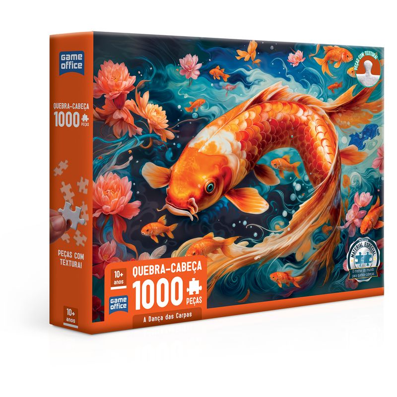 Quebra-cabeça de 1000 peças da linda dança das Carpas, cheio de movimento e beleza! Este quebra-cabeça vem com padrão internacional de qualidade e encaixe suave que pode ser sentido em cada peça!