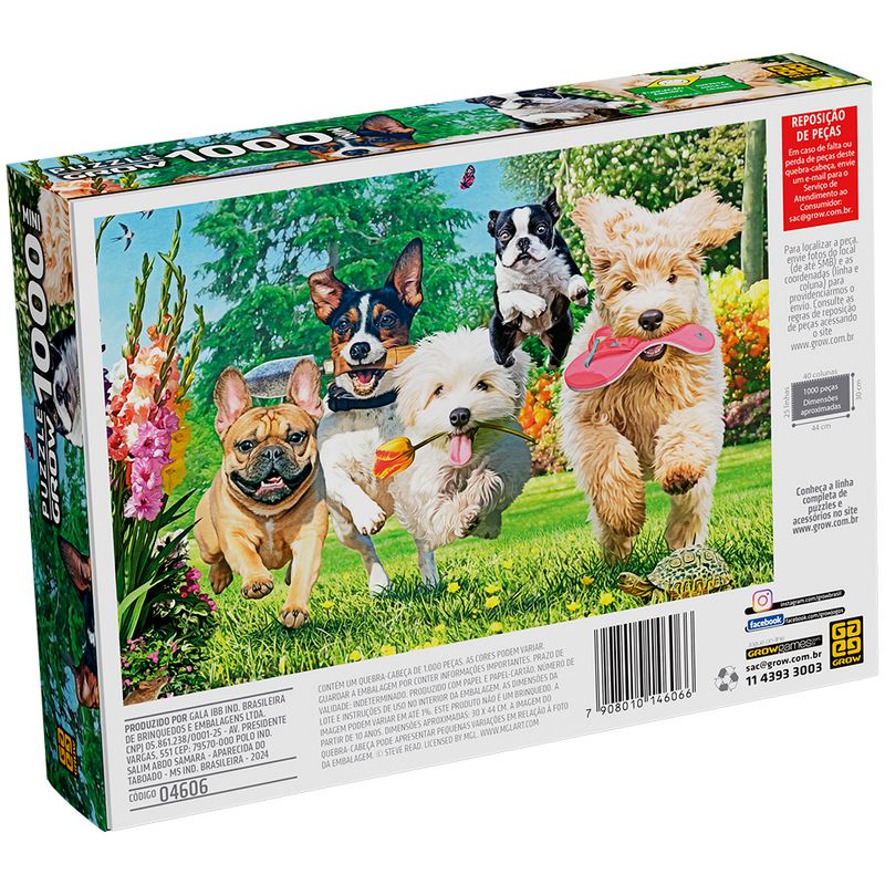 Descubra a alegria de montar o mini quebra-cabeça "Corrida Canina", com 1000 peças. A imagem final revela adoráveis cachorros de diversas raças correndo felizes em um cenário verdejante e vibrante. Com árvores altas, arbustos densos e flores coloridas, este quebra-cabeça é perfeito para amantes de cachorros e entusiastas de desafios, proporcionando momentos de diversão e relaxamento.