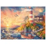 Ao lado do farol, uma bela casa de madeira, com janelas iluminadas e uma varanda charmosa, transmite a ideia de lar e acolhimento – acentuada pelo faroleiro descendo as escadarias junto de seu cachorro em meio a uma rica vegetação."
