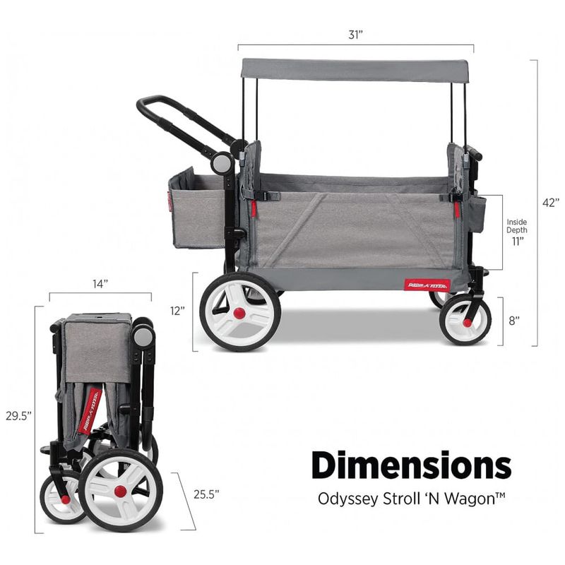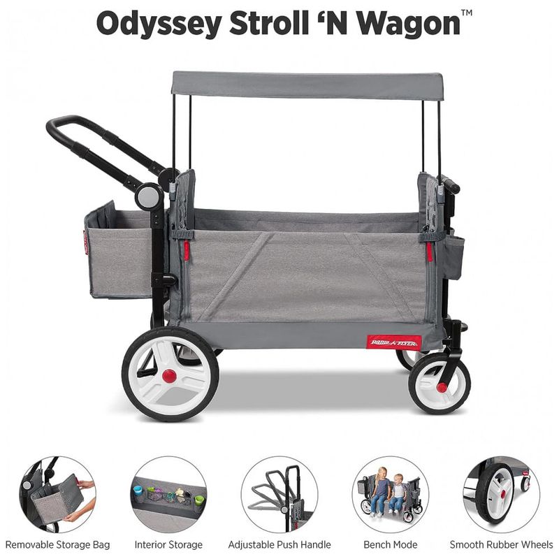 CAPACIDADE DE ZENAMENTO O Odyssey Stroll N Wagon pode transportar até 54 kg de crianças Também inclui uma bolsa de zenamento traseira para guardar o dossel quando não estiver em uso e dois porta copos frontais. Há também bolsos internos e 2 porta copos infantis.