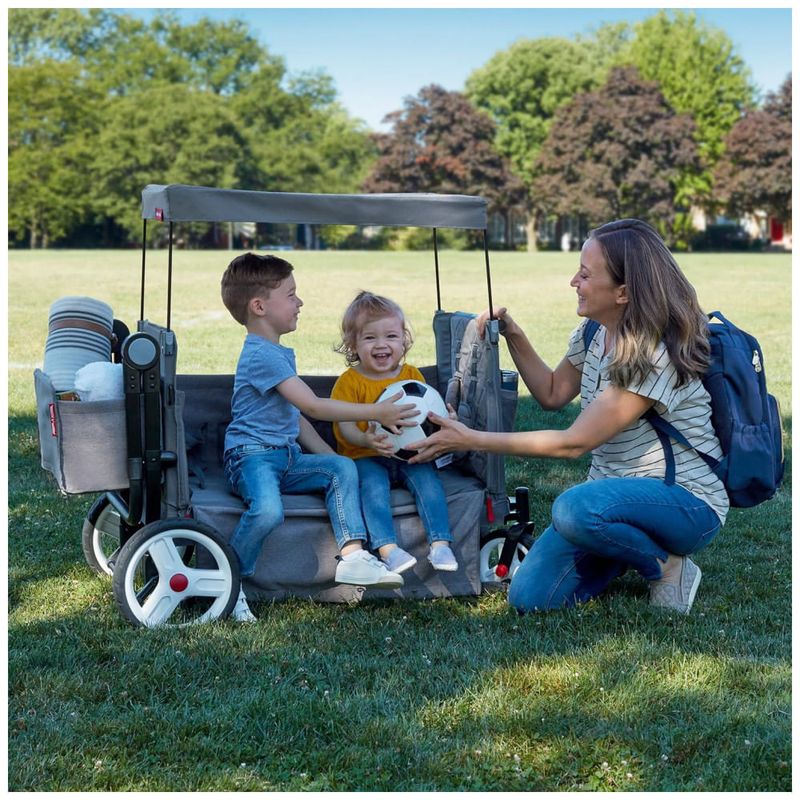 PARA CRIANÇAS Os carrinhos Radio Flyer atendem ao padrão de segurança de brinquedos ASTM F963 13. Este carrinho inclui um freio de pé traseiro, cintos de segurança de 5 pontos e um dossel de proteção UV para proteger seu bebê do sol.