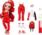 Ruby está vestida de vermelho com um top de manga comprida Sparkle, macacão Sparkle com fivelas douradas e tênis xadrez Sparkle. Ela também tem uma mochila essencial com patch personalizado e bordado RH, perfeita para guardar seus acessórios.