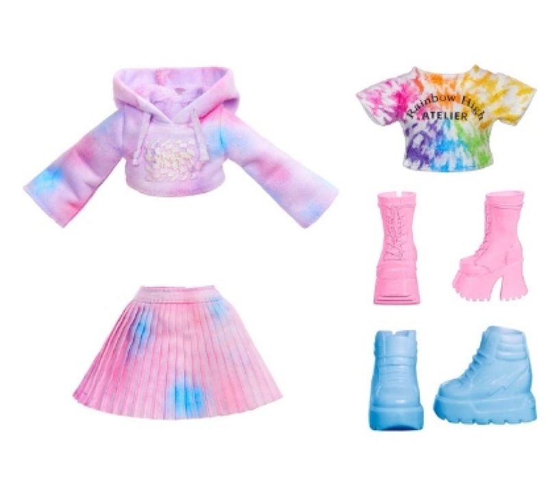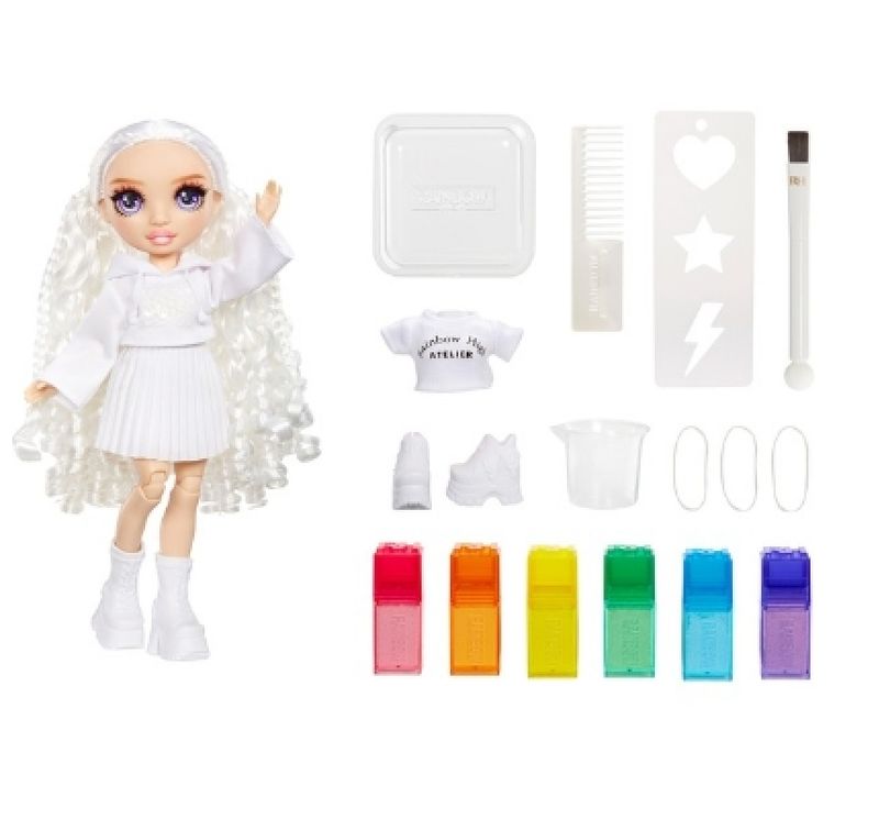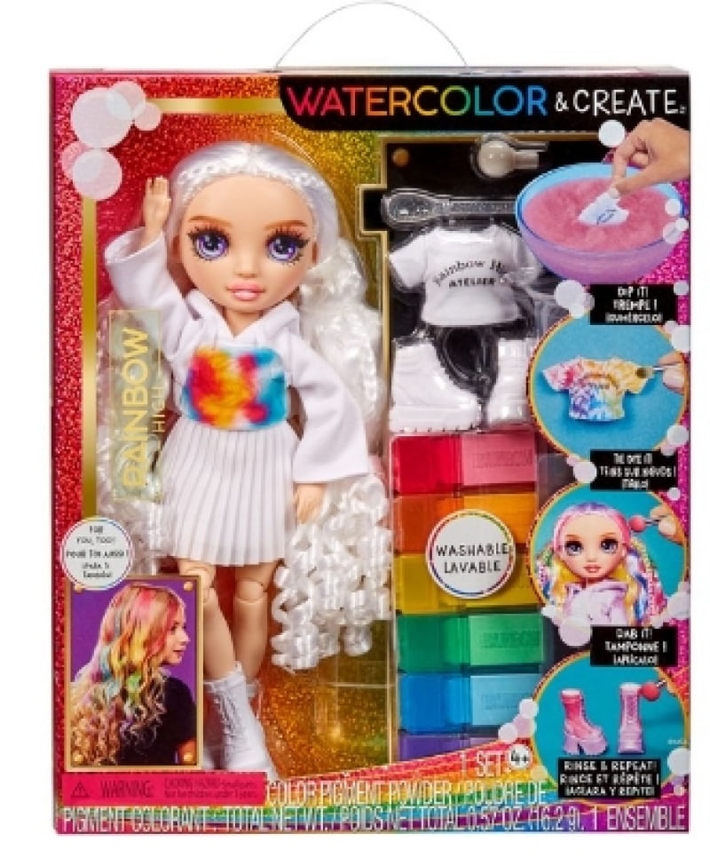 Bonecas DIY de Alta Aquarela e Criar Moda Arco-íris inspiram a criatividade. Aquarela e criação tornam tão fácil projetar sua própria boneca Rainbow High personalizada de tantas maneiras diferentes, até mesmo Tie-Dye! Você pode até usar as aquarelas laváveis em seu próprio cabelo! Então, basta enxaguar e repetir e fazer tudo de novo.