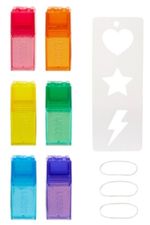 KIT TIE DYE + ESTÉNCIOS! Inclui elásticos para criar designs divertidos de tie-dye - espirais, amassados e muito mais. Os estênceis facilitam a criação de formas divertidas no cabelo e na moda.