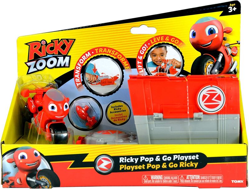 prepare-Se Para Ampliar a Aventura! o Conjunto Ricky Zoom Pop & Go Está Pronto Para Equipar Ricky com Acessórios e Dar-Lhe Velocidade! Este Conjunto Pop & Go Inclui Uma Versão Exclusiva do Ricky Zoom com Gráficos Que Você Não Encontra em Nenhum Outro Lugar e Um Novo Acessório. Conduza Ricky Zoom Sobre o Botão Transformador Para o Compartimento Ser Aberto Magicamente. Suas Rodas Dianteiras Possuem Movimentos Articulados Que Permitem Que Eles Girem Para a Esquerda e Para a Direita Onde Você Os Aponta.