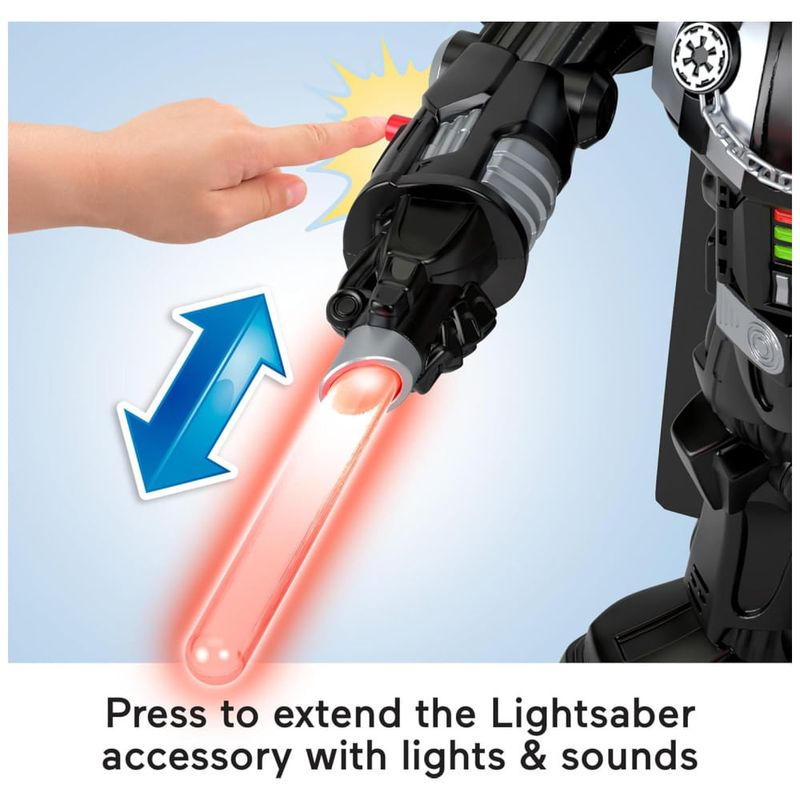 O braço direito possui um sabre de luz extensível com luzes e sons, enquanto o braço esquerdo abre o punho para lançar uma bola de projétil, garantindo horas de diversão. Inspirado em Darth Vader, o robô vem com capa de tecido e sons de respiração icônicos. Inclui uma chave de personagem de metal fundido stormtrooper 7 cm, 1 bola de projétil e 6 discos de projétil.