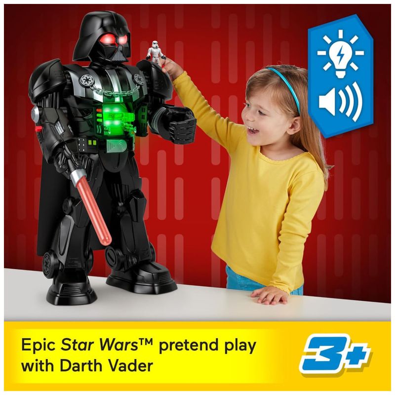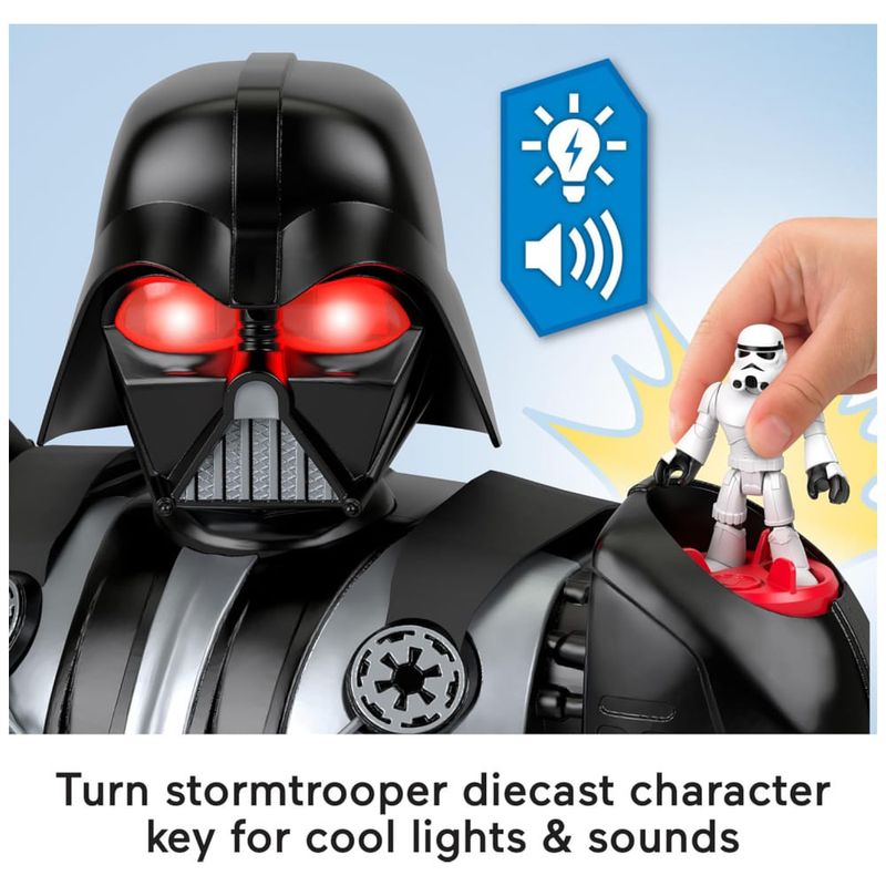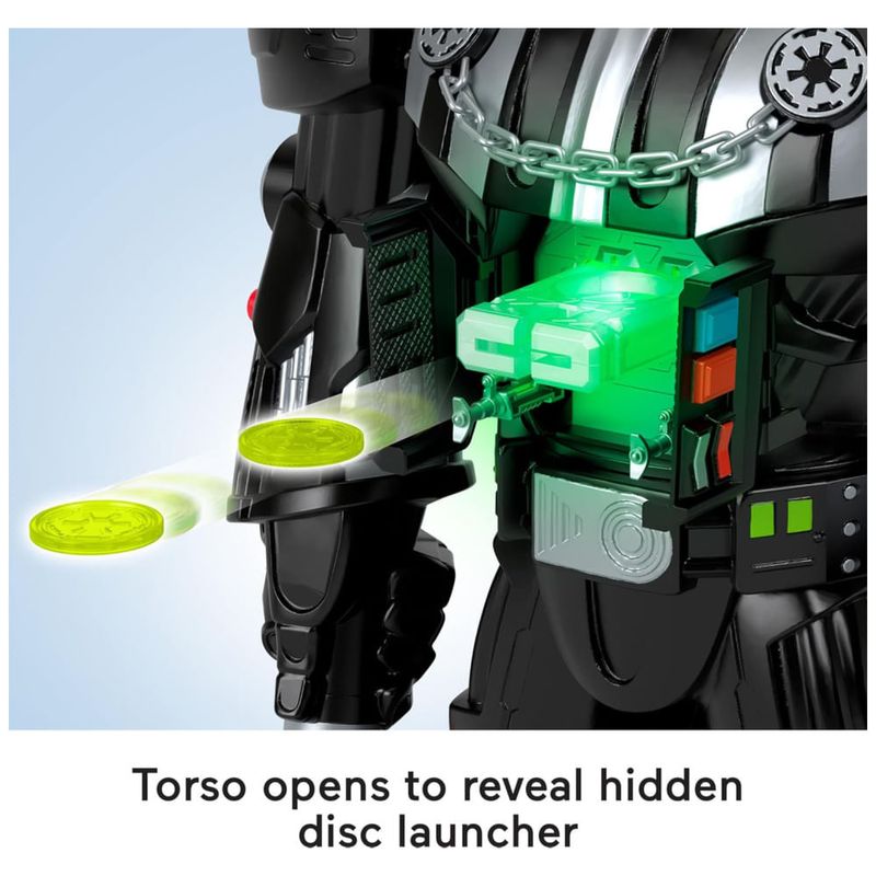 Transforme-se no icônico vilão de STAR WARS com este robô de mais de 60 cm de altura, que oferece luzes, sons e ação controlada pelas crianças para uma experiência de brincadeira imersiva. Basta colocar a chave do stormtrooper no painel de controle do ombro e girar para ativar luzes, sons e abrir o torso do robô, revelando um lançador de disco escondido!