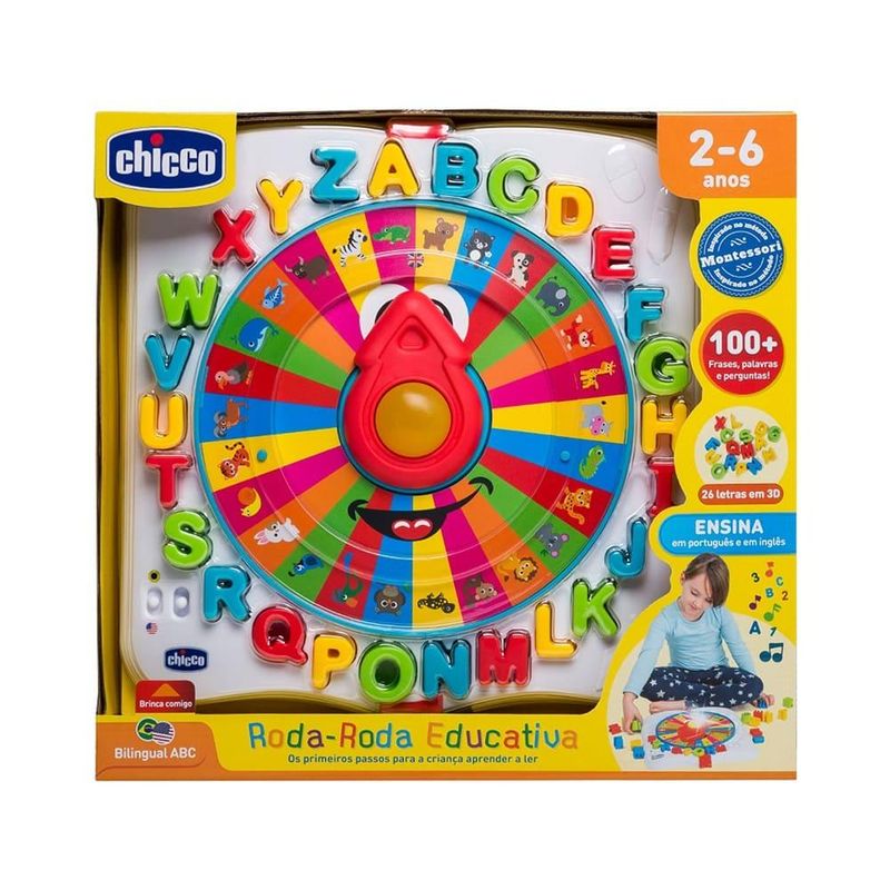 Roda Roda Educativa Bilingue - Chicco A Roda Educativa é um jogo educativo que ajuda a criança em sua primeira aproximação ao alfabeto e as primeiras palavras em português e inglês. Três modos de jogo diferentes com diferentes níveis de aprendizagem: Modo Alfabeto: a criança aprende como as letras são pronunciadas; Modo animal: a criança aprende os nomes dos animais a partir de cada letra do alfabeto; Terceiro Modo: escute as perguntas e encontre a letra correta ou o animal correto! O jogo é inspirado no método Montessori, e tem 26 letras removíveis de plástico 3D, para estimular o toque e se tornar um divertido jogo de articulações. Chicco - aprender brincando. Idade recomendada: de3 a 6 anos de idade. Selo INMETRO: CE-BRI/FBQ - 104195-16.