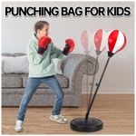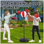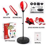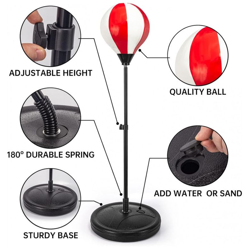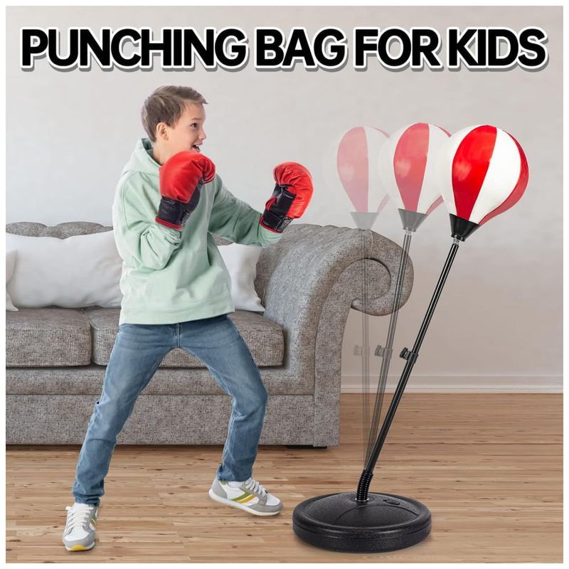 Saco de pancadas infantil ShyLizard com suporte ajustável, desenvolvido para crianças de aproximadamente 5 a 10 anos, acompanhado de 2 pares de luvas e bomba de ar para uso doméstico. O conjunto inclui bola de boxe inflável em suporte vertical, base para enchimento com água ou areia e mola resistente que permite movimentação da bola em múltiplas direções durante os golpes.?