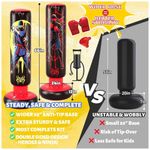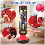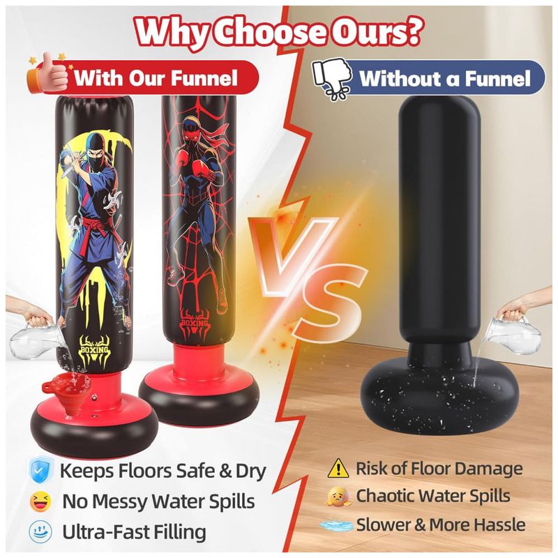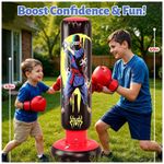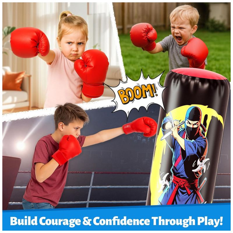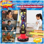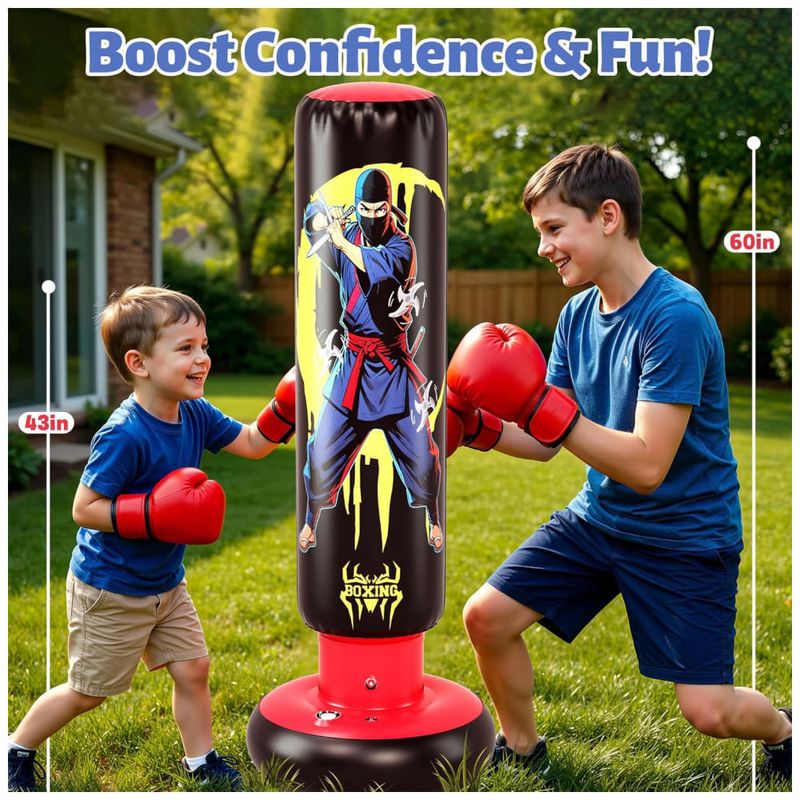 Saco de pancadas inflável infantil JOY SPOT! com 168 cm de altura, desenvolvido para boxe e artes marciais recreativas por crianças na faixa etária infantil. O modelo possui estampa dupla face com tema ninja e herói, estimulando o uso em brincadeiras ativas e treinos leves em casa.?