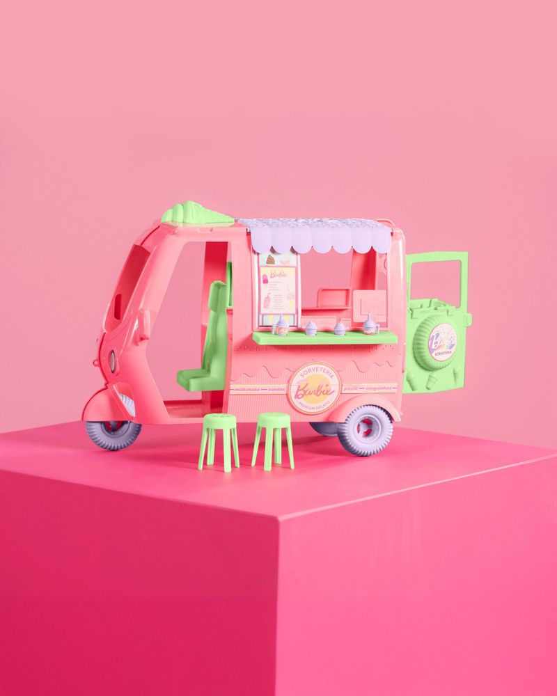 Está fazendo muito calor em Malibu e a Barbie acaba de chegar com a sua nova sorveteria sobre rodas, trazendo muita diversão e refrescância! Em um formato super lúdico, lembrando os icônicos tuk-tuks indianos, possui 3 rodas livres, toldo retrátil e é totalmente decorada com a temática de sorvetes, e acompanha todos os itens essenciais para a Barbie atender a clientela exigente de Malibu! Vem com estante para apoio dos preparos, 2 bancos na altura ideal para a Barbie, pia, máquina de milkshakes, colher de sorvete e 6 preparos prontos para deixar a imaginação fluir! No topo, é decorado com um sorvete derretido super divertido, possui banco para a motorista e porta traseira para fácil acesso das bonecas! Totalmente fabricada em PP, com personalização por adesivos.