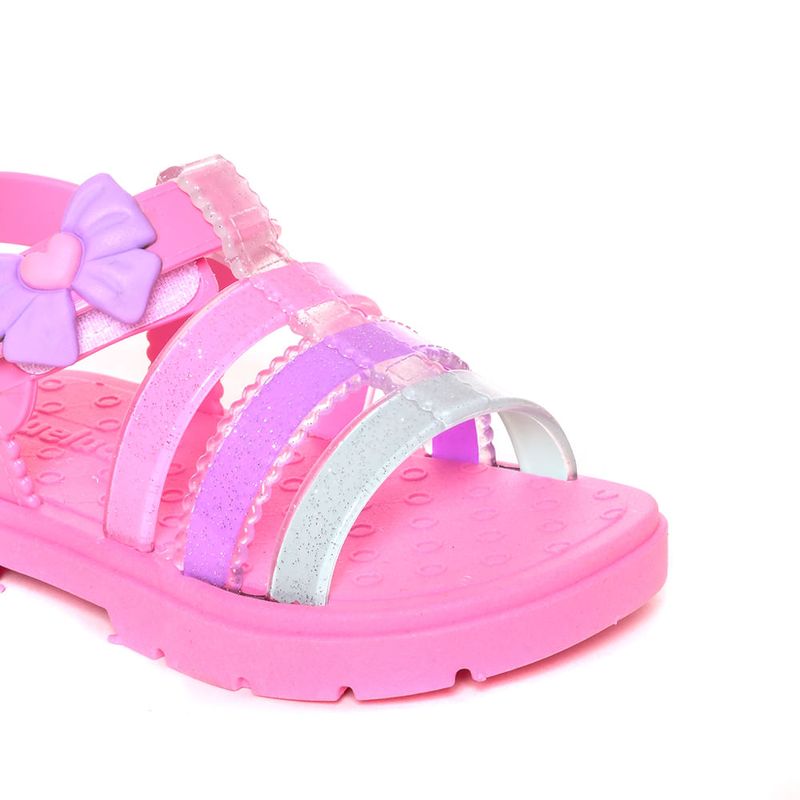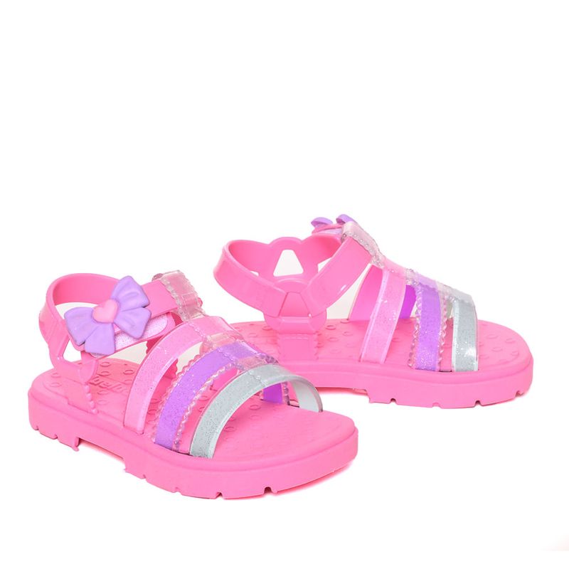 A Sandália Infantil Luelua Colors Rosa é confeccionada em material sintético, possui modelagem papete, tiras fixadoras com glitter e aplicação em forma de laço, com solado com frisos antiderrapantes e acabamento padrão.