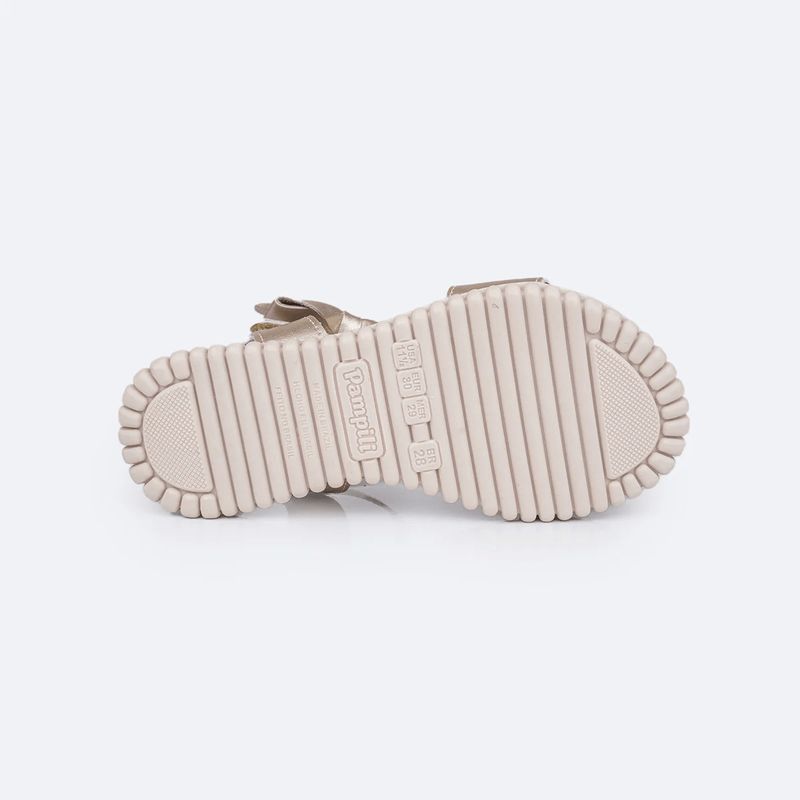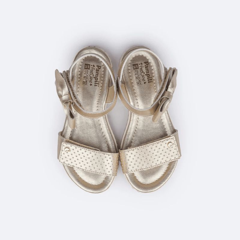 Sandália infantil feminina em sintético dourado, com laço na lateral e perfuros na parte superior, casual e delicada para a menina usar no dia a dia! Papete com palmilha Feet Care, um sistema avançado de fofura, com a densidade ideal para os pés, minimizando impactos. Papete infantil com calce fácil em velcro, facilitando o calce para as meninas. Solado feito em material emborrachado que possui aderência com o chão, proporcionando flexibilidade, menor desgaste e maior resistência térmica.