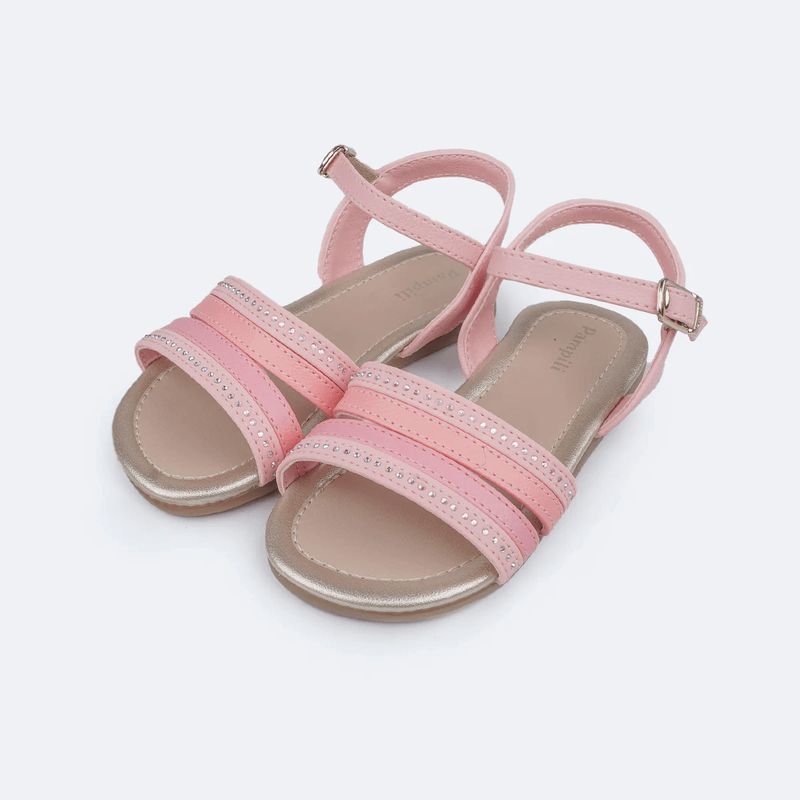 Sandália infantil feminina em sintético dourado, com parte frontal em tiras fixas uma a outra, sendo duas delas em glitter com aplicação de strass em hotfix, dando brilho e estilo aos primeiros passinhos! Palmilha com espuma para mais conforto ao caminhar. A sandália de bebê tem solado emborrachado flexível e antiderrapante, proporcionando maior segurança e aderência ao chão. Sandália infantil fácil de calçar com fivela easy, sem pino no fechamento, uma tecnologia desenvolvida pela nossa equipe para trazer praticidade para a mamãe.