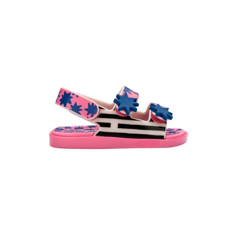 Modelo exclusivo Mini Melissa e Fábula desenvolvida em plástico PVC estampado, tiras reguláveis e fecho prático em velcro.