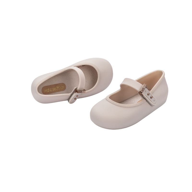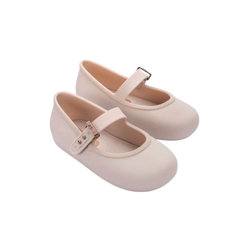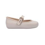 Sapatilha Mini Melissa Infantil Bege com Fivela feita em Melflex, com tira ajustável e aroma característico. Ideal para looks delicados e uso diário.