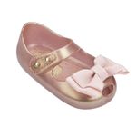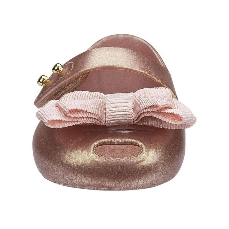 Na cor rosa metalizado, a My First Melissa conta com um aplique de laço em gorgurão rosa e fechamento com velcro, para facilitar a colocação, sem incomodar o bebê!