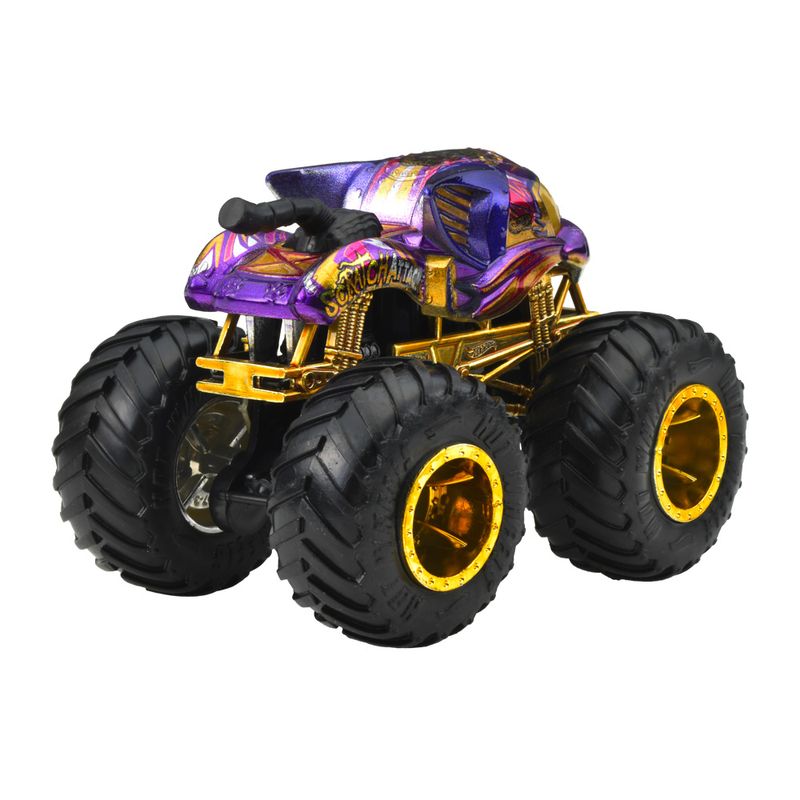 Scratch Attack - Monster Trucks Trophy Champions Marca do produto: Hot Wheels - Mattel. Escala: 1/64 (comprimento 9 cm; largura 6,3 cm; altura 5,5 cm) Carcaça em Metal e Partes de Plástico. Pneus de Borracha. Entre na comemoração do 50º aniversário do Bigfoot, o Monster Truck original, com um caminhão de brinquedo comemorativo especial! Cada veículo die-cast em escala 1:64 apresenta um personagem Monster Truck favorito dos fãs e possui recursos premium, como decoração e detalhes dourados. Inclui também um troféu do campeonato Hot Wheels Monster Trucks Live. Com 10 caminhões favoritos dos fãs para escolher e três troféus possíveis, colecionadores e crianças de 3 a 6 anos vão querer todos eles. Cada modelo é vendido separadamente. Cores, estilos e decorações podem variar. Contém 1 Moster Truck e 1 Troféu