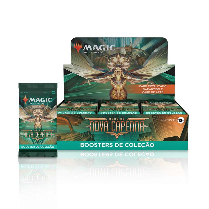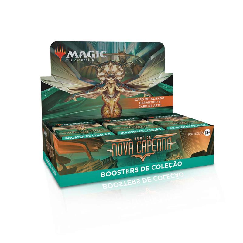 A Caixa de Boosters da Coleção de Ruas de Nova Capenna contém 30 Boosters da Coleção de Ruas de Nova Capenna e 1 card especial metalizado tradicional com arte alternativa — Recepcionistas do Baile. Cada Booster da Coleção contém 12 cards de Magic, 1 Card de Arte e 1 ficha, card de publicidade, de ajuda, card de marcador destacável ou especial da história de Magic (um card da “Lista”) Cada booster contém uma combinação de 1 a 4 card(s) raros/míticos raros e 3 a 7 cards incomuns, 3 a 7 comuns e 1 card de terreno. (Terreno de Metrópole com arte expandida em 33% dos boosters). Um card que não seja arte ou terreno metalizado tradicional ou metalizado dourado. O card de terreno é metalizado tradicional em 21% dos boosters, e um card de arte assinado substitui o card de arte em 5% dos boosters da coleção. Um card da Lista substitui a ficha ou card de anúncio em 25% dos boosters de coleção.
