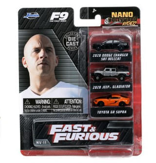 O Set II em miniatura com 3 carros (Dodge Charger SRT Hellcat, Jeep Gladiator, Toyota GR Supra), da linha Nano Metalfigs, escala 1.65 IN, Jada Toys. Produzida em metal com detalhes em plástico, apresenta alto grau de detalhamento, e pintura nas cores preto, prata e laranja.