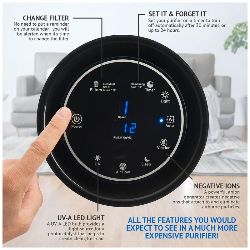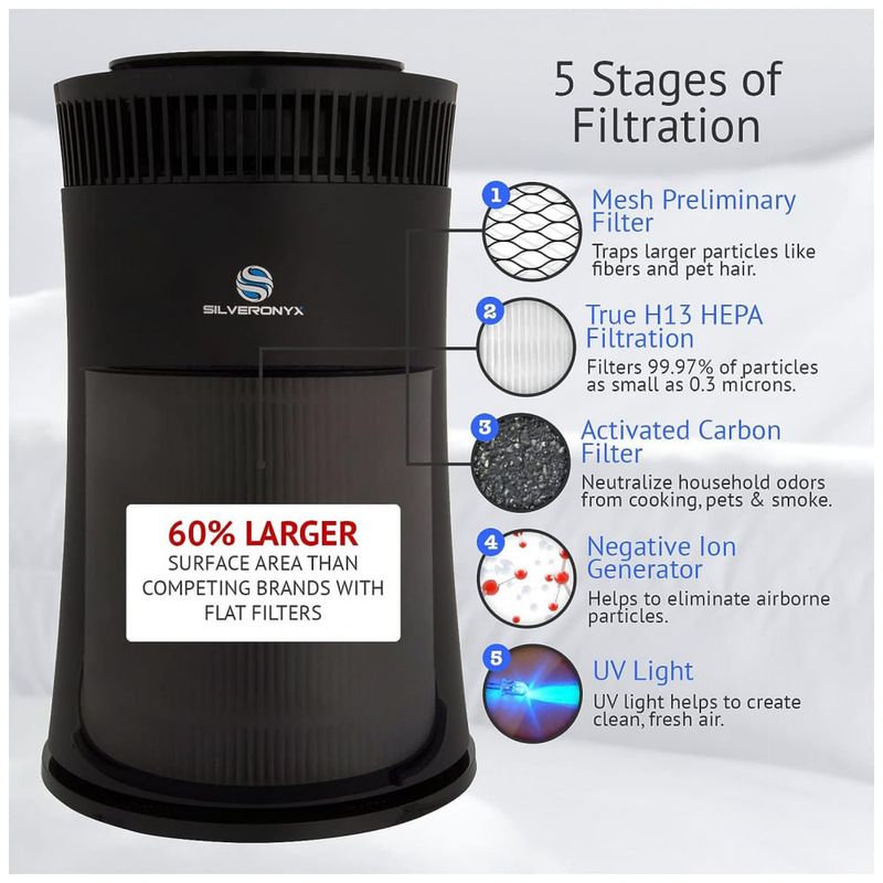 Purificação de ar poderosa Respire facilmente com o purificador de ar SilverOnyx True HEPA. Oferecendo desempenho poderoso em um design compacto e leve, sua filtragem de 5 estágios retém partículas maiores como pêlos de animais, filtra partículas ultrafinas como poeira e neutraliza odores domésticos. Sabe se que o filtro HEPA H13 do purificador de ar filtra partículas ultrafinas, capturando 99,97 de poeira e alérgenos tão pequenos quanto 0,3 mícrons. Além disso, um ionizador embutido e um desinfetante UV ajudam a remover bactérias, fungos e germes nocivos. Recursos Filtros de filtragem de cinco estágios poderosos 99,97 de partículas ultrafinas O pré filtro captura partículas maiores. Neutraliza odores domésticos O purificador de ar HEPA SilverOnyx True HEPA apresenta cinco estágios de filtragem de ar para um ar fresco e limpo, livre de alérgenos, bactérias transportadas pelo ar e outros poluentes. Um pré filtro prende partículas maiores, como cabelos e pêlos de animais. Para partículas ultrafinas, o filtro True HEPA H13 captura 99,97 de poeira e alérgenos de até 0,3 mícrons. Um filtro de carvão ativo neutraliza os odores domésticos e o ionizador destrói os alérgenos transportados pelo ar. Finalmente, uma luz UV ajuda a destruir contaminantes como mofo e germes. Este purificador de ar compacto e leve é ideal para fumantes e donos de animais de estimação e foi projetado para uso em salas de até 47 metros. Possui um sensor PM2.5 material particulado que ajusta automaticamente o fluxo de ar para garantir a mais alta qualidade do ar. O filtro True HEPA H13 de alto desempenho tem uma área de superfície 60 maior do que as marcas comparáveis com filtros planos, permitindo que ele efetivamente limpe e higienize o ar. Este purificador de ar possui um visor de botão fácil de usar para acessar a ventoinha variável de 5 velocidades, ionizador embutido, luz UV C, modo de suspensão, temporizador on , off, modo automático com sensor PM2.5 e muito mais