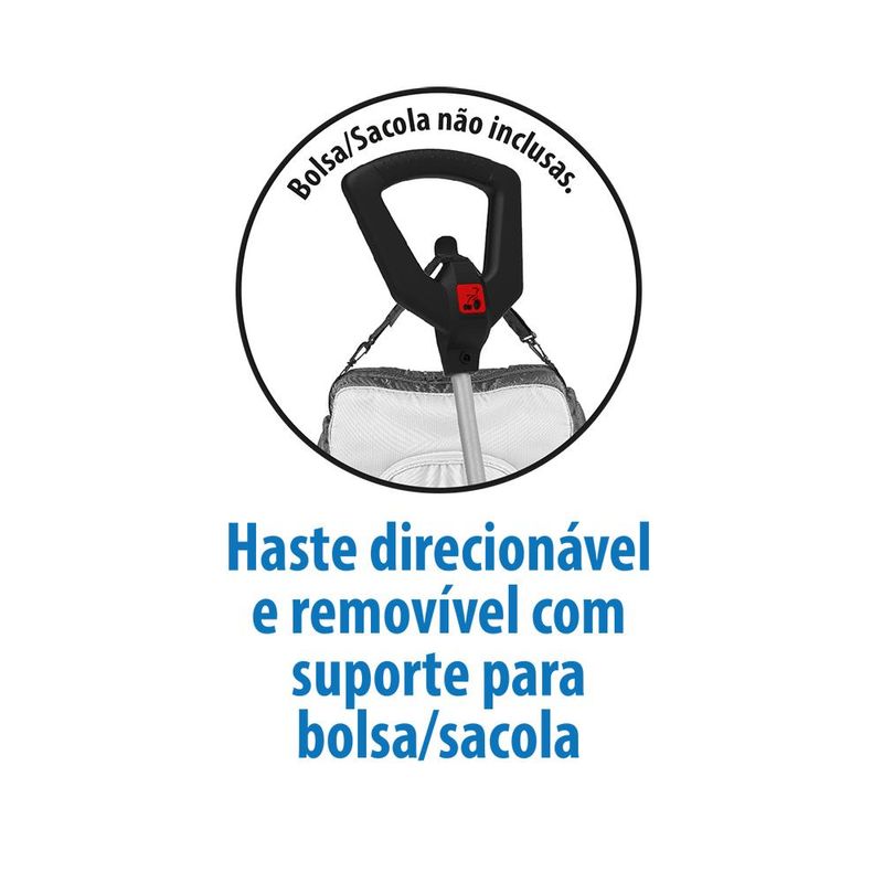 Haste direcionável e removível com suporte para bolsa ou sacola. Cercado de proteção removível, com prático sistema de abertura lateral. Baú sob o assento para armazenar pequenos objetos.