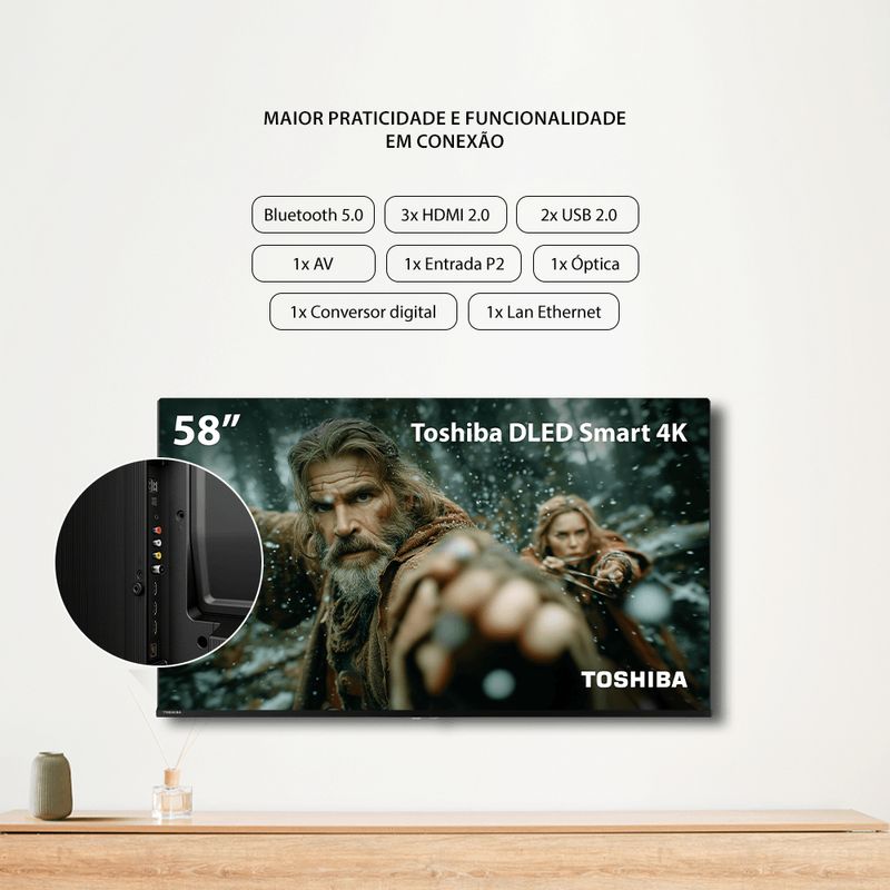 Reconhecida por sua inovação e qualidade, a Toshiba é sinônimo de durabilidade e desempenho superior em tecnologia de entretenimento. Ao escolher a Smart TV DLED 58" 4K UHD Toshiba Vidaa, você investe em uma experiência premium que vai transformar seu entretenimento em casa.