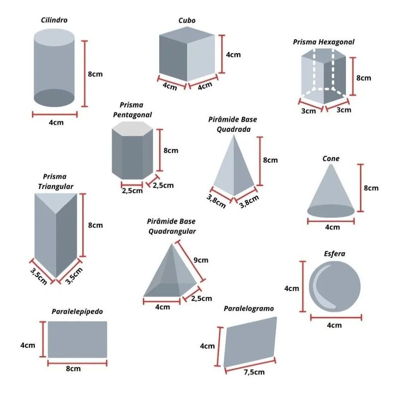 O conjunto vem com 11 peças diferentes, incluindo formas como cilindros, cones e esferas. As peças são acondicionadas em uma caixa tipo estojo medindo 24 cm de comprimento x 18,5 cm de largura x 7 cm de altura, o que as torna fáceis de armazenar e transportar.